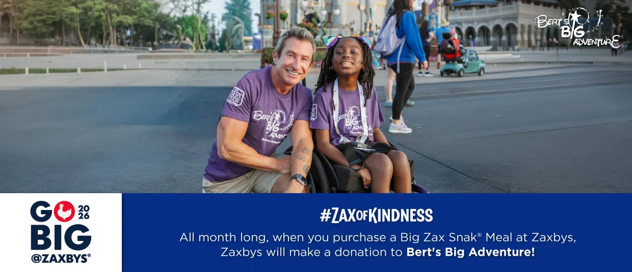 This month, when you purchase a Big Zax Snak® Meal at Zaxbys, Zaxbys will make a donation to Bert’s Big Adventure!